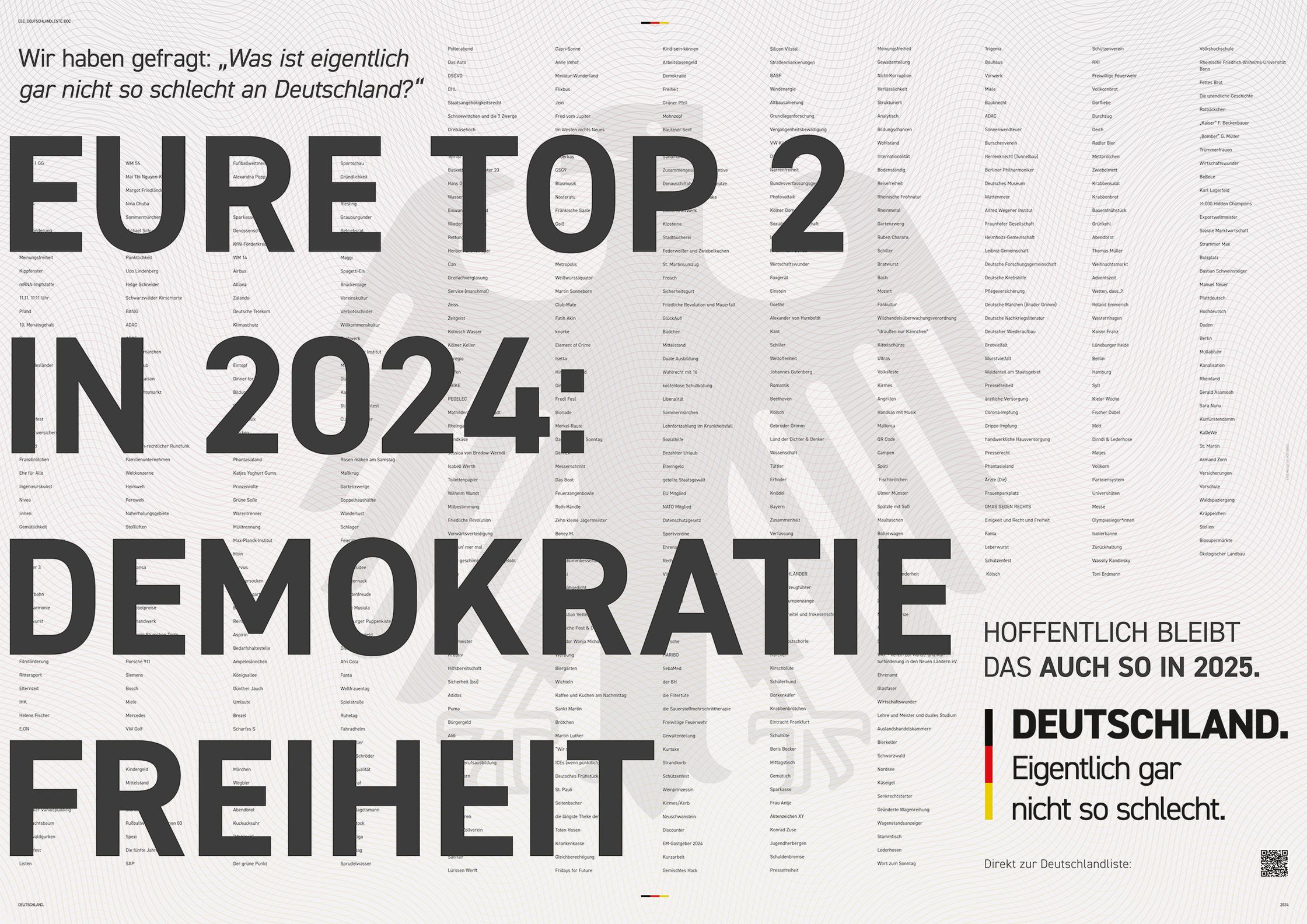 Im Auftrag des Handelsblattes erstellte die BBDO als eine von drei Agenturen im Oktober 2024 eineMutmacherkampagne. Für Deutschland.Ziel dabei war es, wieder für mehr positive Stimmung im Land zu sorgen – trotz und gerade wegen derherausfordernden Situationen, denen Deutschland sich aktuell immer wieder stellen muss.Umgesetzt werden, sollte der Auftrag mithilfe einer der Lieblingsdinge der Deutschen: Einer Liste.Die Liste ergab sich aus mehreren hundert deutschen Alleinstellungsmerkmalen, die das BBDO Kreativteamund seine Mitarbeiter sammelten.Dabei wurden sowohl politische als auch scheinbar banale - aber doch identitätsstiftende - Aspektezusammengetragen. Alles Dinge, die Deutschland für sie ausmachen.Unter dem Mantel der typisch deutschen Zurückhaltung, bildet das Fazit dieser Liste selbstironisch der Satz:Deutschland, eigentlich gar nicht so schlecht.Selbst bei der Gestaltung lies die Kreativagentur keine Möglichkeit aus, sich liebevoll über das deutscheBehördentum lustig zu machen. So bediente sich die BBDO vieler für Deutschland typischer Zeichen, wie demBundesadler im Hintergrund und den häufig für offizielle Dokumente genutzten Wasserlinien.Die fertige Liste wurde dann im Handelsblatt veröffentlicht.Durch einen integrierten QR-Code, konnten die Leser*innen die offizielle Deutschland-eigentlich-gar-nicht-soschlecht-Website besuchen und sich mit eigen Vorschlägen am Projekt beteiligen.Besonders Bürokratie-liebende Bürger*innen bekamen sogar die Möglichkeit, der Agentur ihre Ideen per Faxzukommen zu lassen. Über 1000 Menschen ließen sich für das Projekt begeistern und fügten Punkte von „FKK“und „Benjamin-Blümchen-Torte“, bis „Artikel 1 GG“ hinzu.Wer sich die Auflistung genauer ansieht, erkennt, dass einige der Anfangsbuchstaben gemeinsam den Namender deutschen Nationalhymne: „Einigkeit und Recht und Freiheit“ ergeben.Um die Deutschland Liste aus den Bildschirmen und Zeitschriften zu holen und in die reale Welt zu integrieren,kreierte das Kreativ-Team der BBDO OOH-Plakate, die für einige Tage in Berlin aufgehängt wurden.Hintergrund der Kampagne war es, die Menschen spüren zu lassen, wie leicht es ihnen fällt, sich so viel Positivesüber das Land einfallen zu lassen, dem sie sonst häufig so skeptisch gegenüberstehen.Die Kreativagentur hat dazu angeregt, mal wieder die kleinen und großen positiven Aspekte Deutschlands zuzelebrieren, die im Alltag vergessen, übersehen oder nicht wertgeschätzt werden.Nach Aussage von TEAMBBDO Strategiechef Achim Schauerte, sollte die Kampagne außerdem einenOptimismus bei den Entscheider*innen wecken, trotz all der aktuellen Probleme.