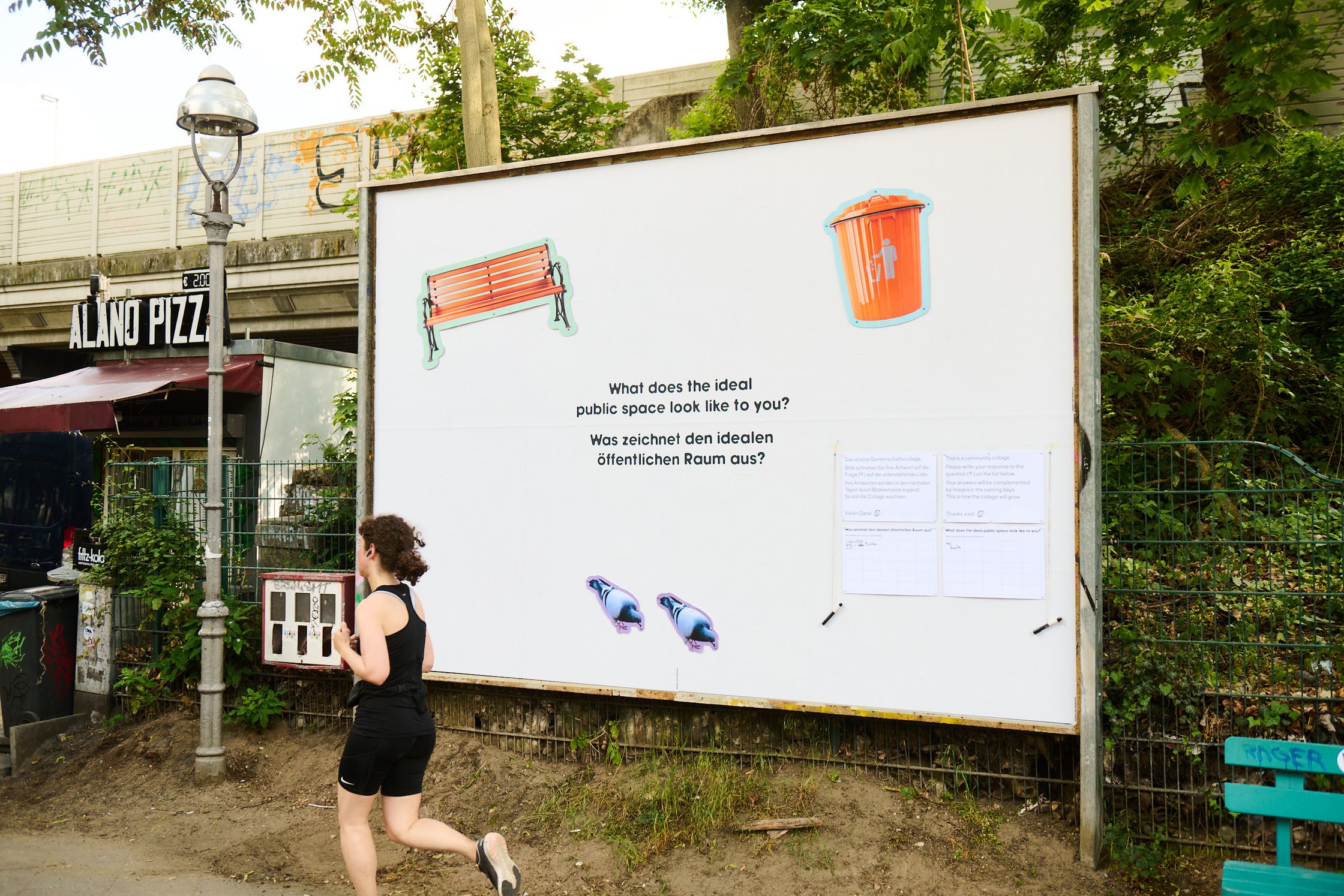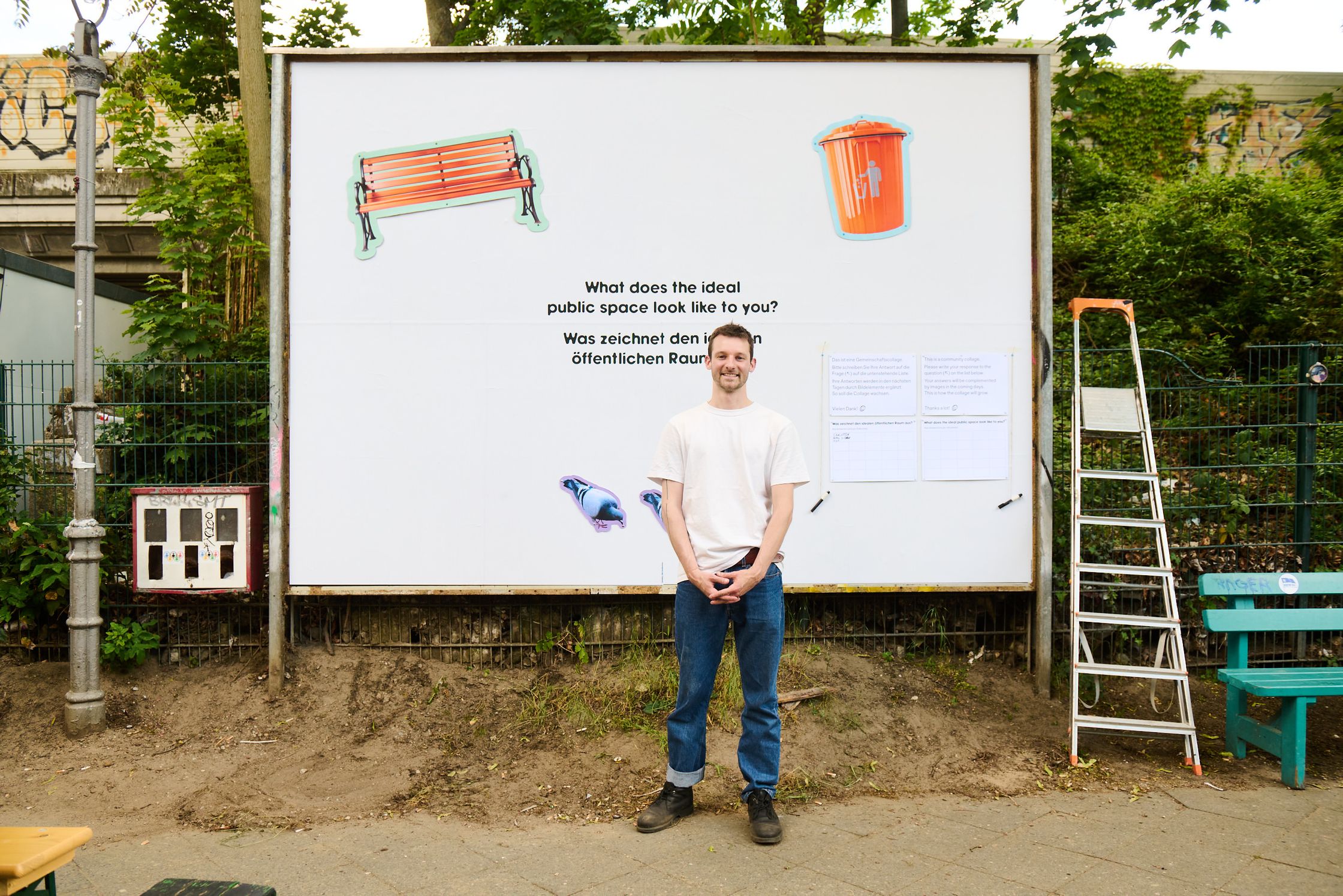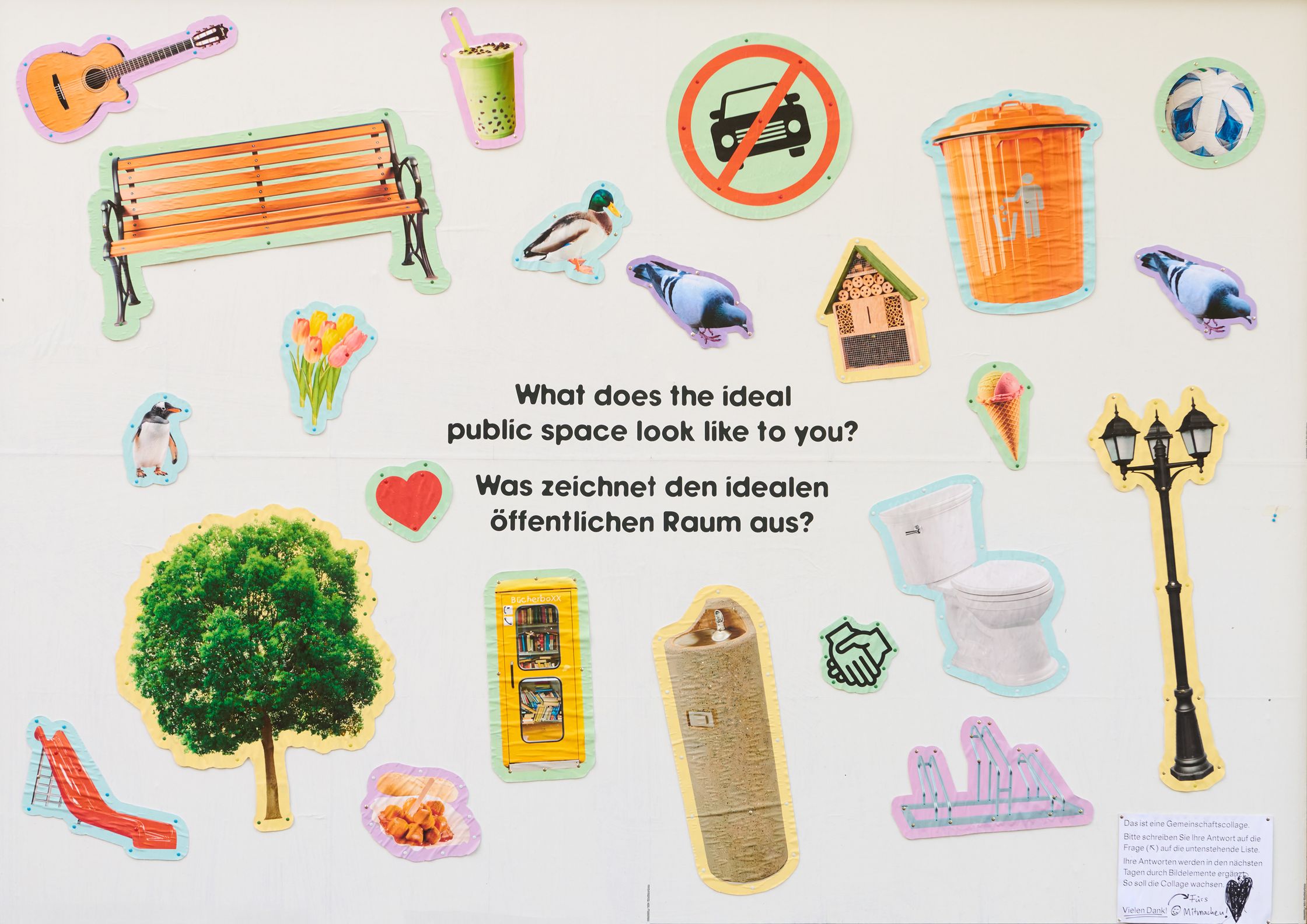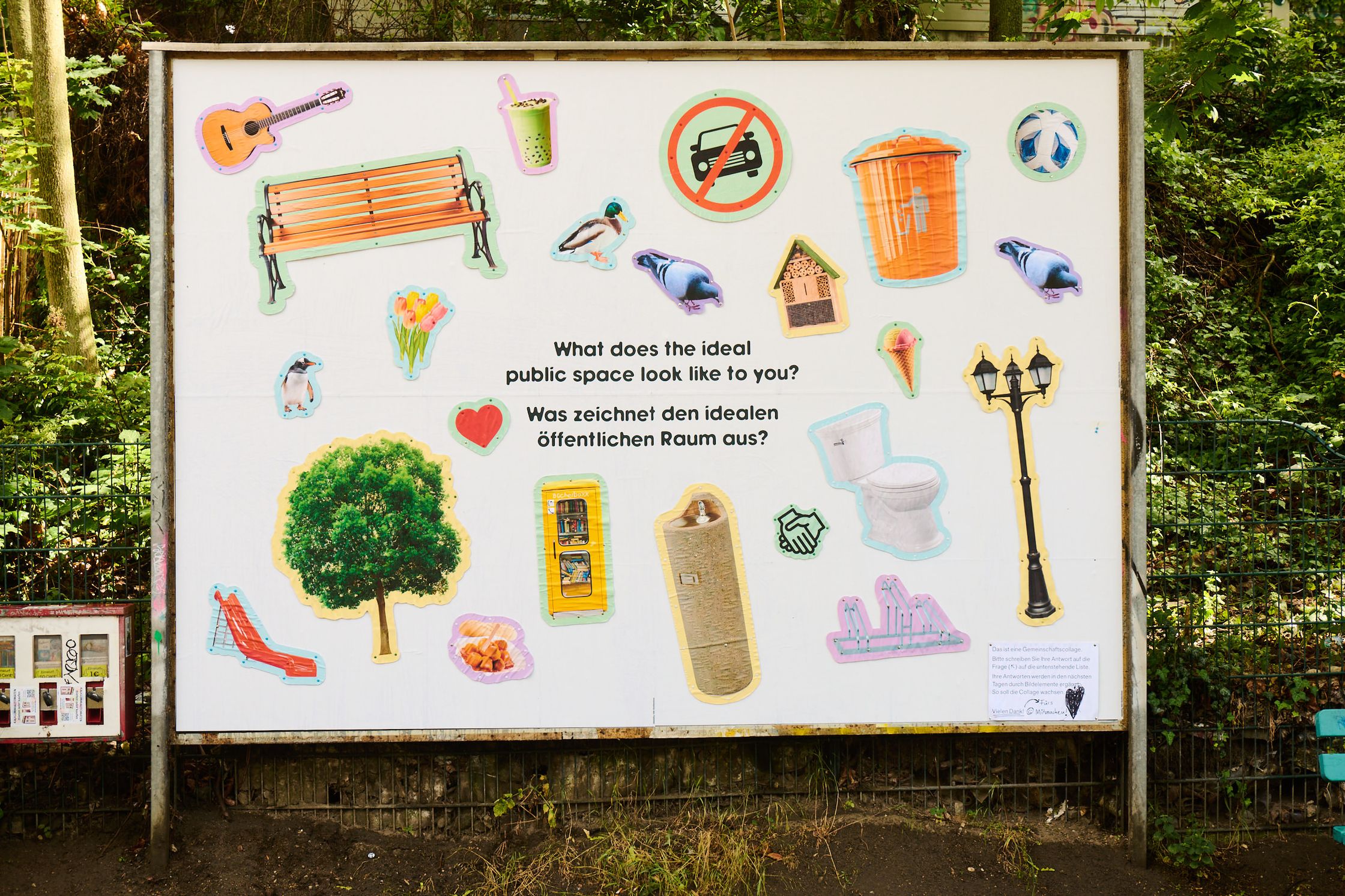 What characterises the ideal public space? To get to the bottom of this question, the billboard became a community collage for ten days. The space was provided with a list of answers and a pen and passers-by were invited to answer the question on site. Every two days, the answers were scrutinised and graphic elements were created based on them - over the course of ten days, a collective vision of the “ideal” public space was created.