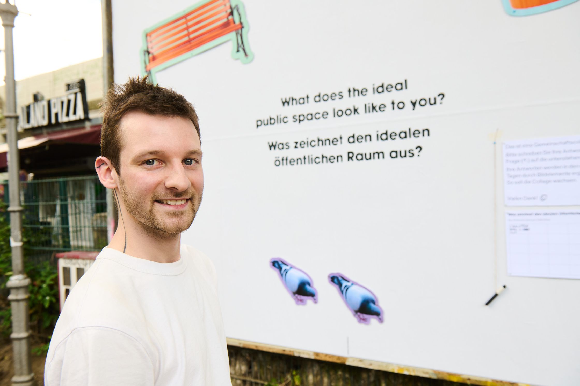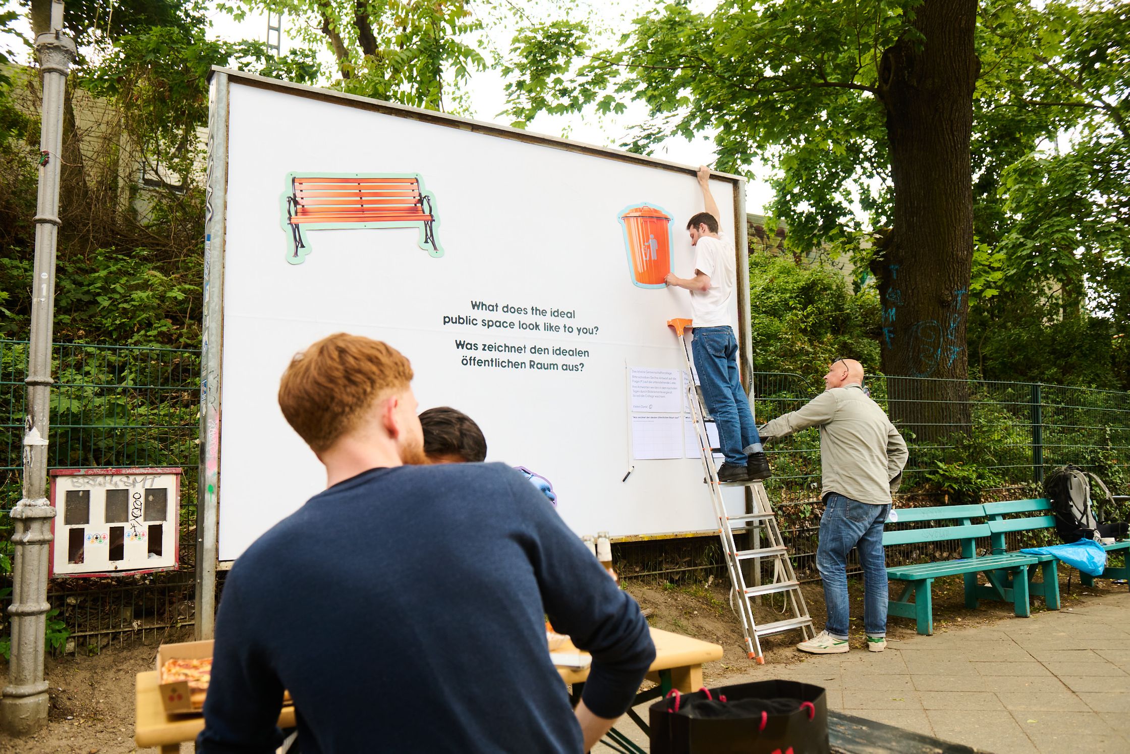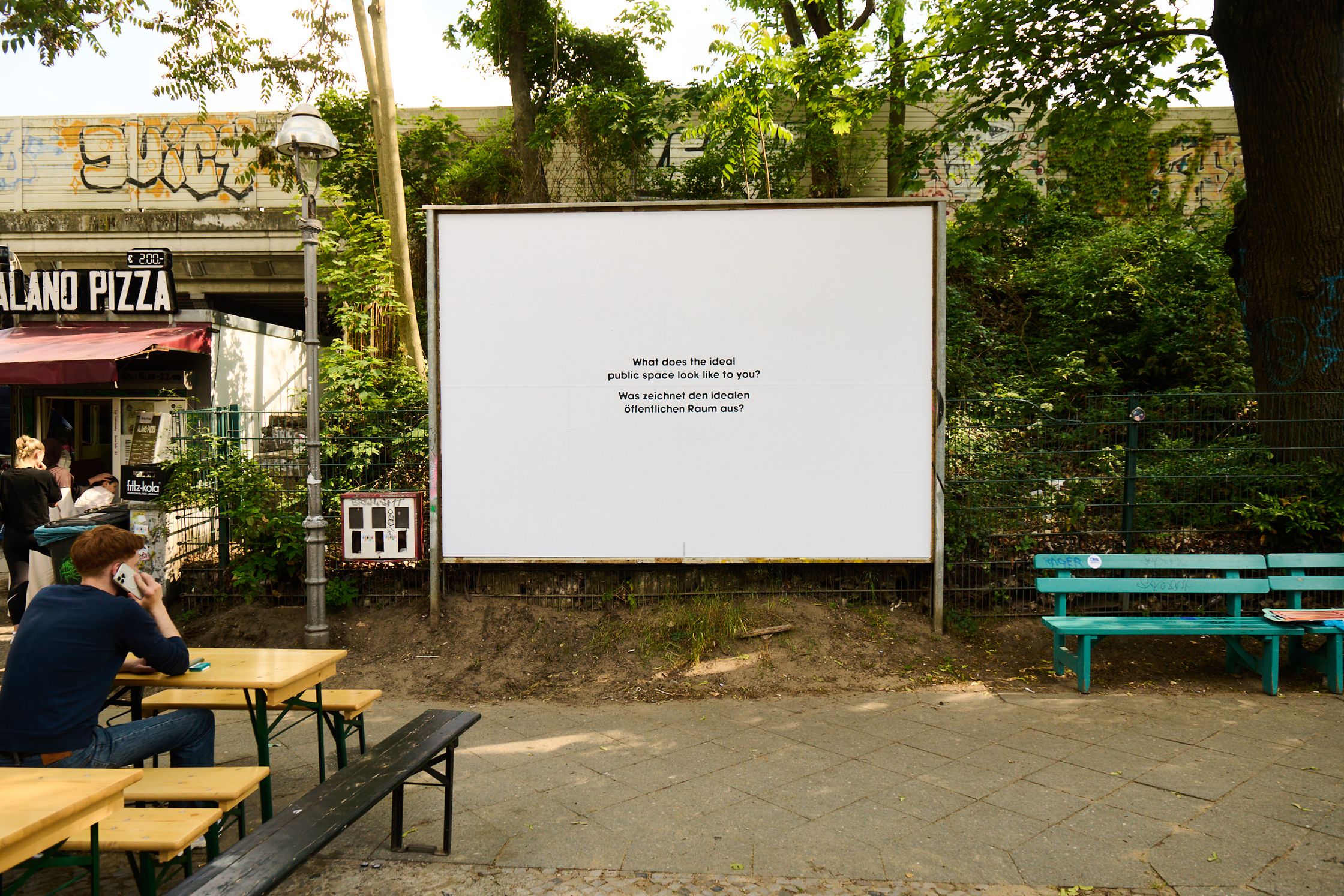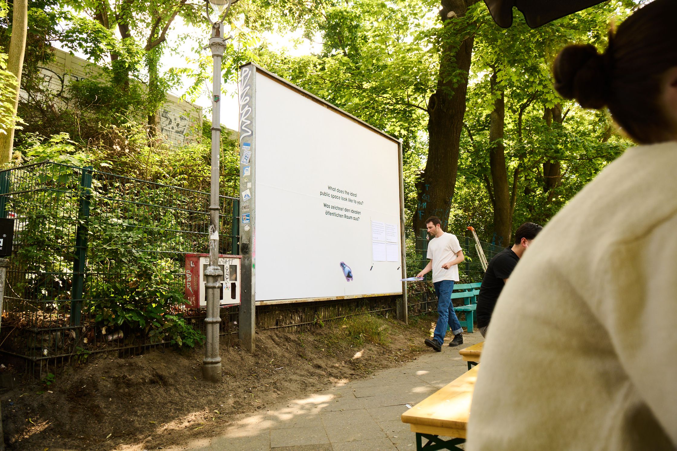 What characterises the ideal public space? To get to the bottom of this question, the billboard became a community collage for ten days. The space was provided with a list of answers and a pen and passers-by were invited to answer the question on site. Every two days, the answers were scrutinised and graphic elements were created based on them - over the course of ten days, a collective vision of the “ideal” public space was created.