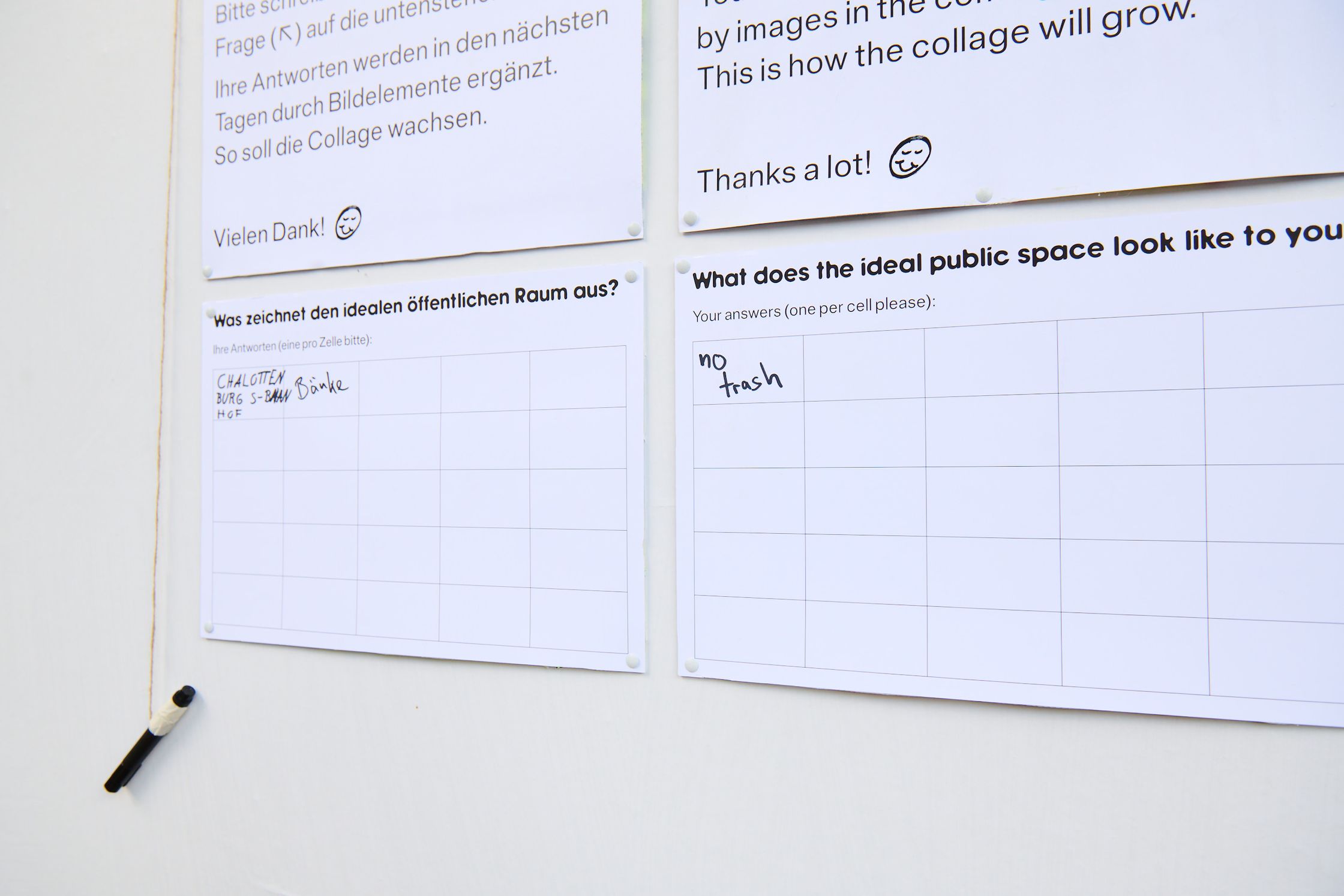 Was zeichnet den idealen öffentlichen Raum aus? Um dieser Frage auf den Grund zu gehen, wurde die Großfläche für zehn Tage zur Gemeinschaftscollage. Die Fläche wurde mit Antwortliste und Stift versehen und Passant*innen wurden eingeladen, die Frage vor Ort zu beantworten. Alles zwei Tage wurden die Antworten gesichtet und darauf basierend grafische Elemente angefertigt - so entstand über 10 Tage hinweg eine gemeinschaftliche Vision des ‘idealen’ öffentlichen Raums.