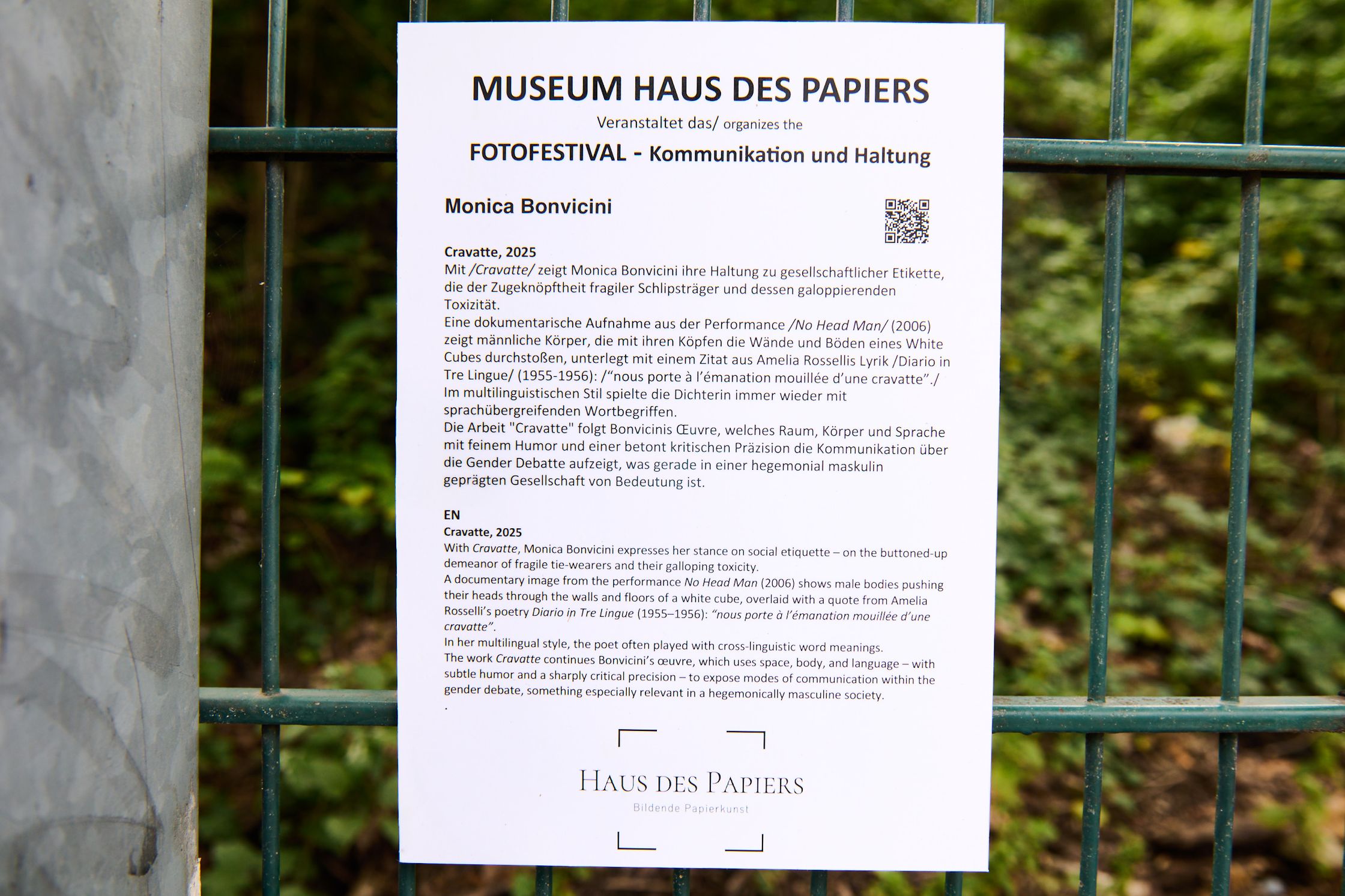Die Arbeit "Cravatte" folgt Bonvicinis Œuvre, welches Raum, Körper und Sprache mit feinem Humor und einer betont kritischen Präzision die Kommunikation über die Gender Debatte aufzeigt, was gerade in einer hegemonial maskulin gepragten Gesellschaft von Bedeutung ist.