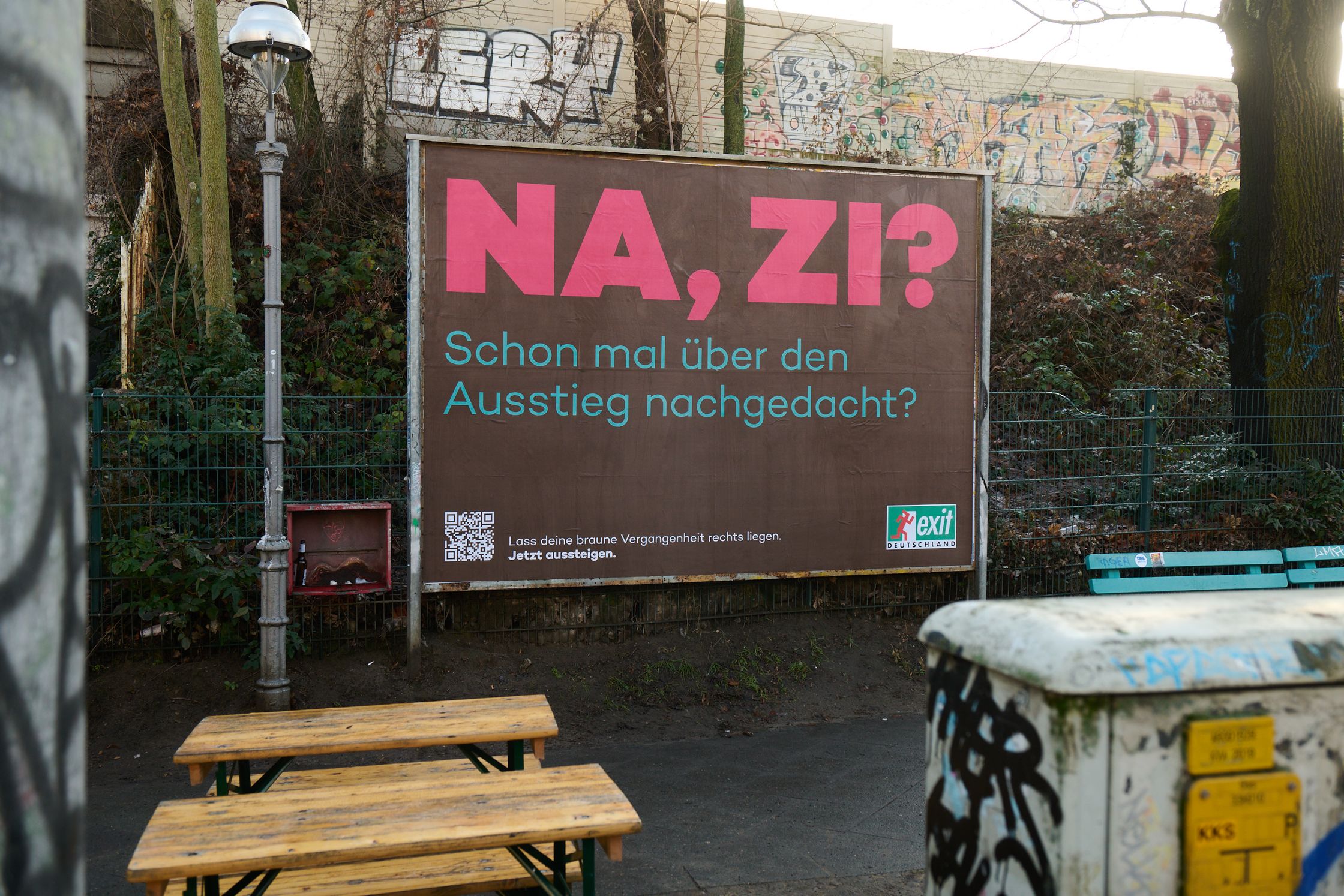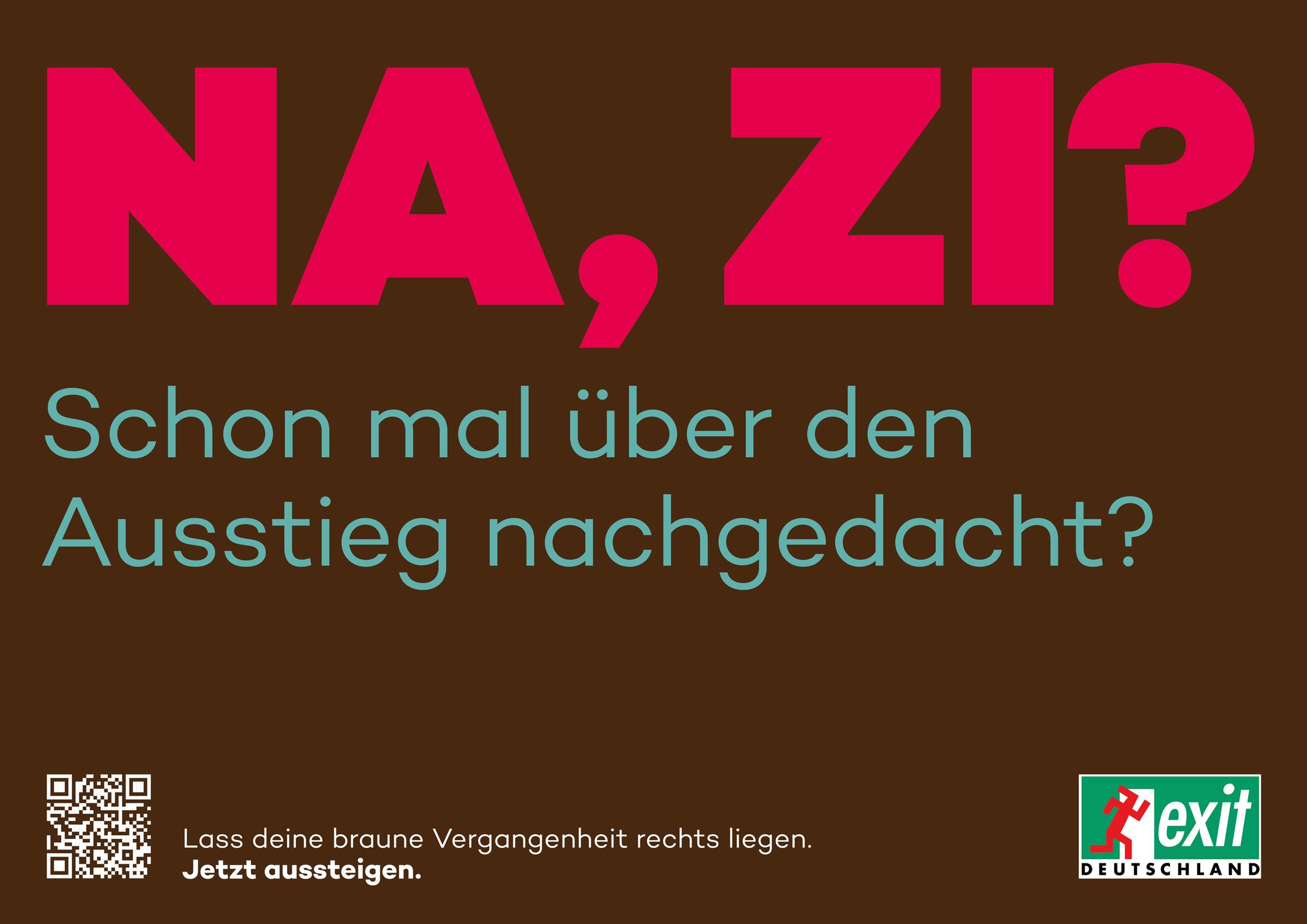 Dann wende Dich an EXIT-Deutschland. Die Organisation bietet seit 25 Jahren Wege aus dem Extremismus und hilft Dir, Deine braune Vergangenheit hinter Dir zu lassen. Wir durften Exit Deutschland, eine NGO, die Rechtsextremen beim Ausstieg hilft, mit dieser Plakat-Aktion unterstützen.