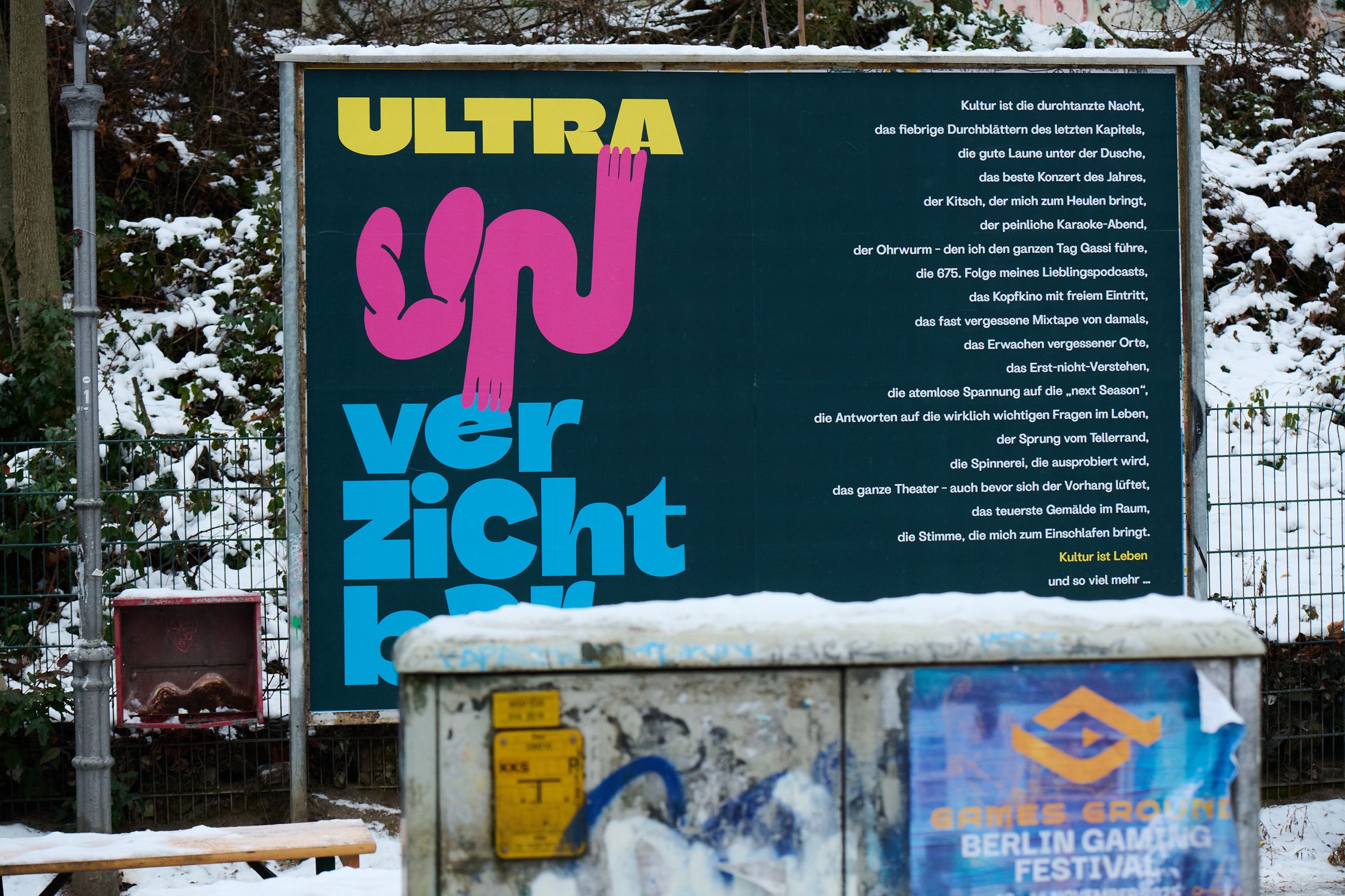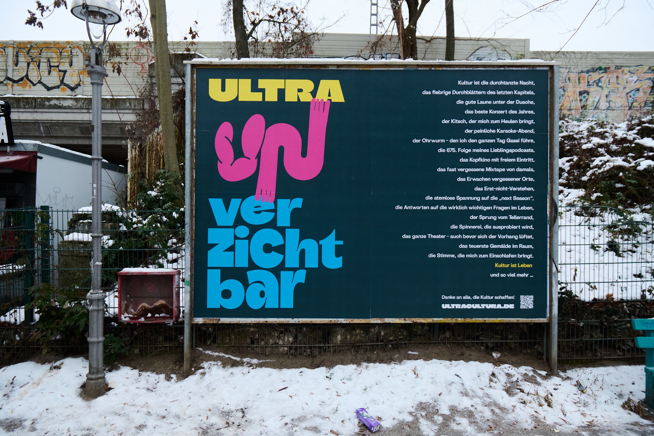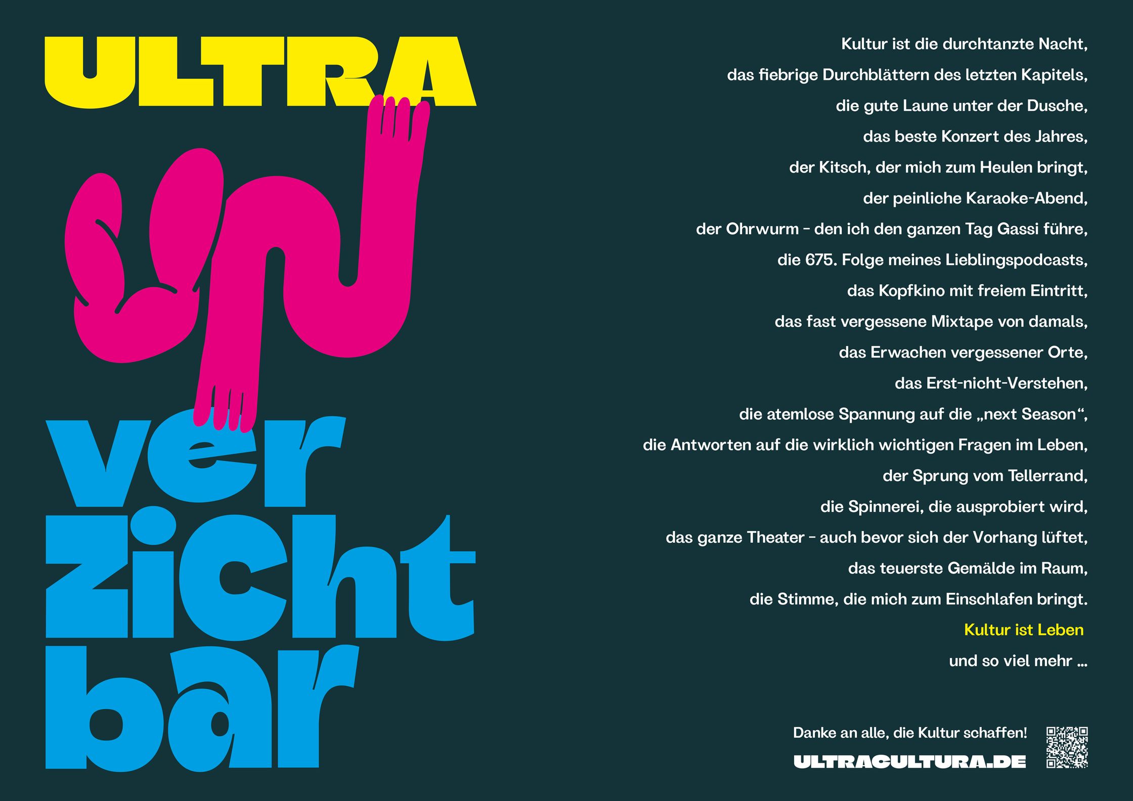 Culture is indispensable in life. It connects people, opens up perspectives, creates meaning and community. We would therefore like to thank everyone who creates culture – and everyone who enables others to participate in it. Based on this appreciation, we have founded an initiative to make cultural engagement visible, strengthen it, and create spaces for exchange together. Ultra Cultura is our statement for an open, accessible, and sustainable culture. Ultra Cultura connects ideas, formats, and perspectives to develop concrete solutions for the current challenges facing cultural institutions. From accessibility to target group expansion to digital transformation—we combine communication, design, and attitude to create real added value for cultural institutions.