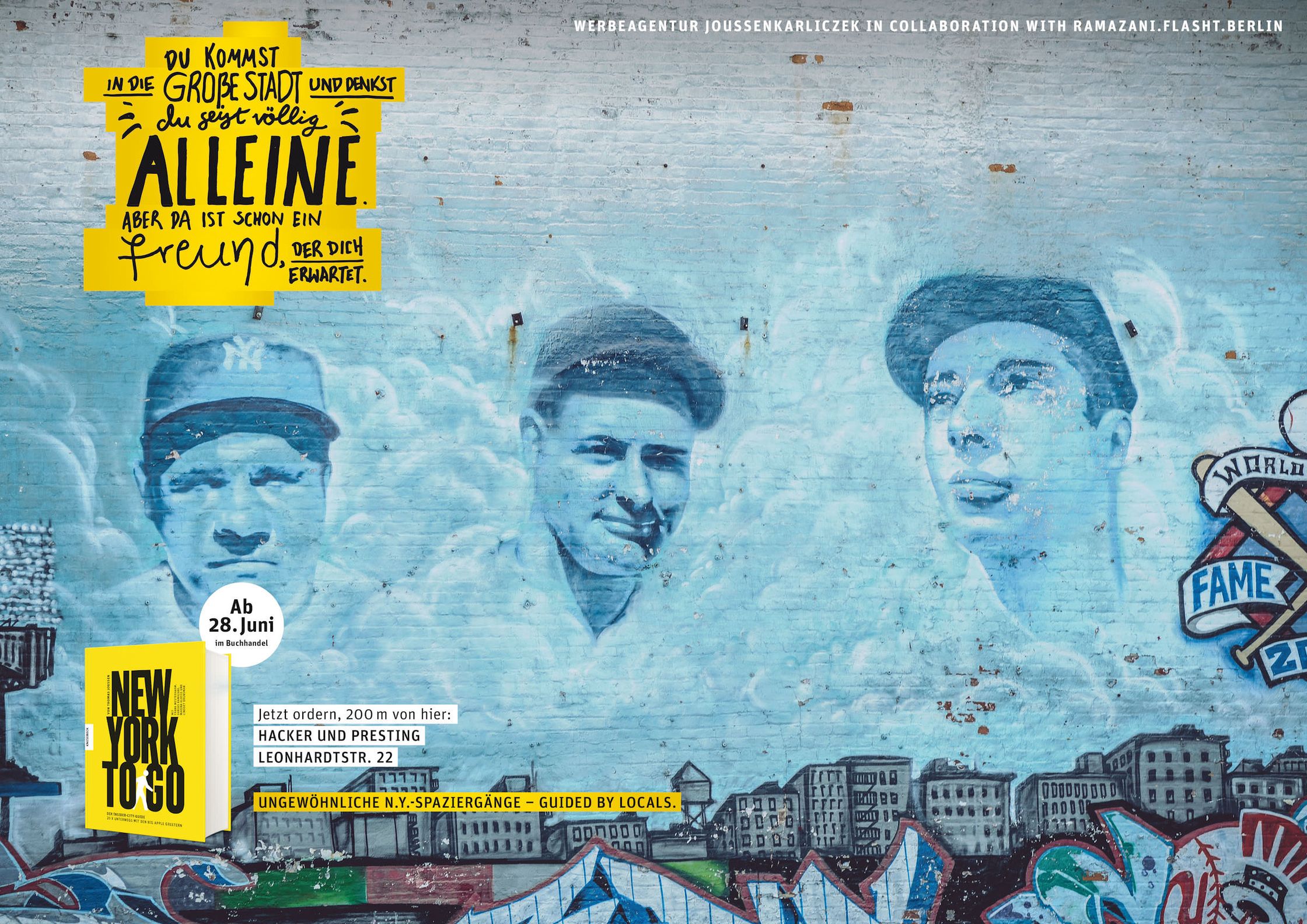 The organization 'Big Apple Greeter' offers visitors in New York to personally introduce them to the fascinating city at Hudson River and welcome them. Thomas Joussen and his team (with Frank Mesterharm and the three photographers Lindsey Brunsman, Marina Kloess and Darius Ramazani) walked through New York with 20 of these Big Apple Greeters and had them show their hood. With a motive photographed by Darius Ramazani, the book was advertised.