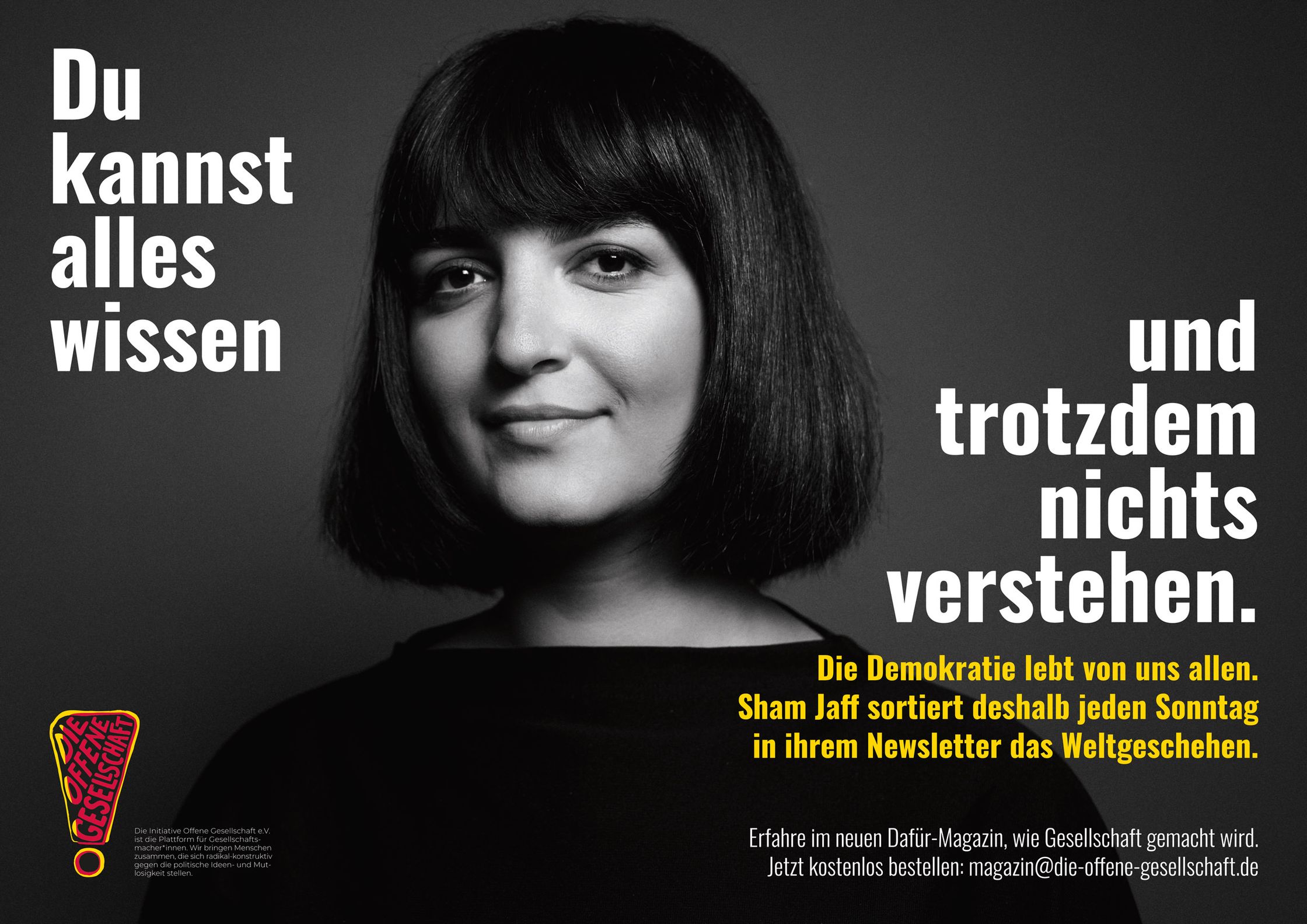 Die tägliche Nachrichtenflut ist für viele Menschen fast unerträglich. Sham Jaff versucht, sie in den Griff zu bekommen. Mit ihrem Newsletter "What happened last week" sortiert sie einmal pro Woche das Weltgeschehen. "Die offene Gesellschaft" ist eine Initiative, die neue Räume für Ideen und konkrete Utopien schaffen will. Als #dafür Plattform bringt sie Menschen zusammen, die sich radikal konstruktiv gegen die politische Ideen- und Mutlosigkeit stellen und keine Lust mehr auf den eskalierenden gesellschaftlichen Diskurs haben.